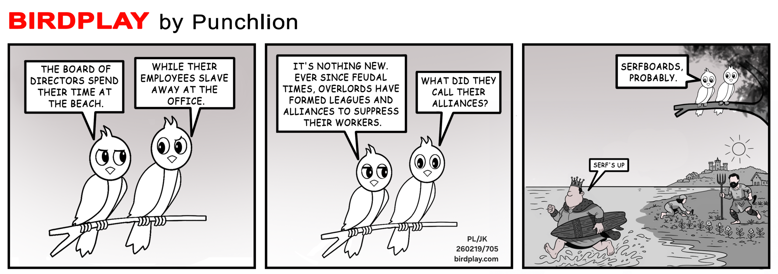 By Bird PlayFebruary 19, 2026 Board of directors at the beach Employees slave away at the office Feudal overlords formed alliances They called them serfboards probably 🌊🕊️ 19 Feb 2026 #Birdplay #dailycartoon #dailytoon