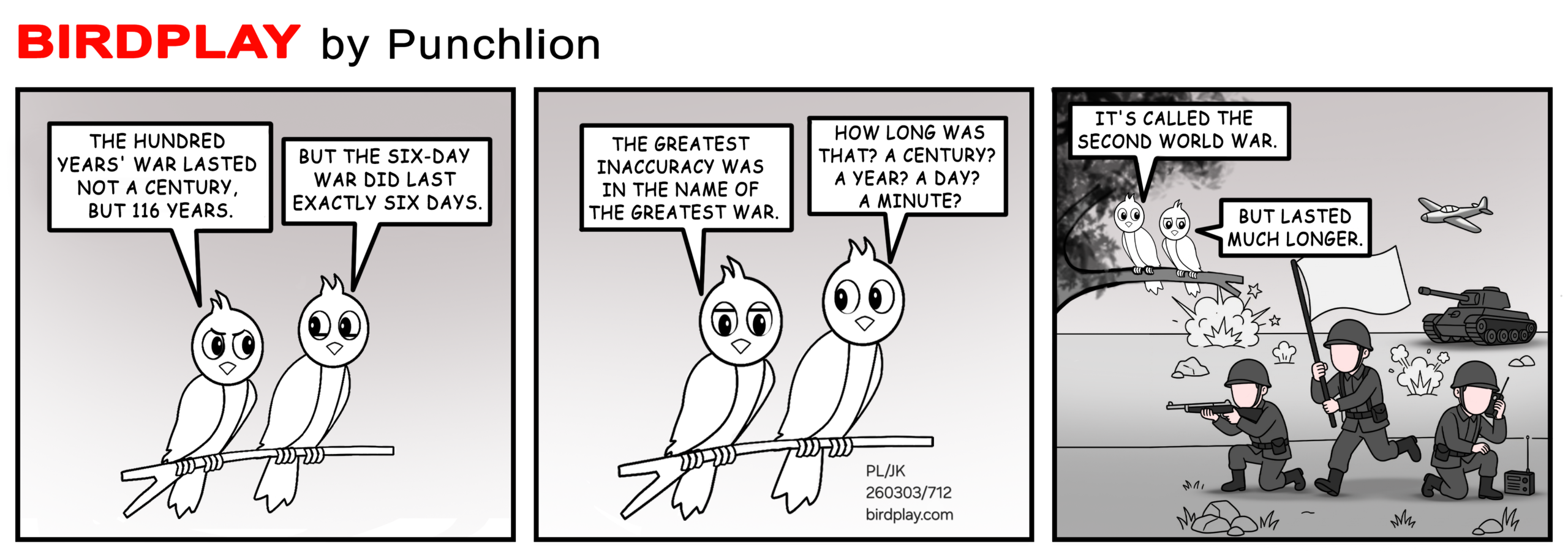 By Bird PlayMarch 3, 2026March 3, 2026 Hundred Years’ War lasted 116 years Six Day War lasted exactly six days Greatest inaccuracy was the greatest war Second World War lasted much longer ⚔️🕊️ 3 Mar 2026 #Birdplay #dailycartoon #dailytoon