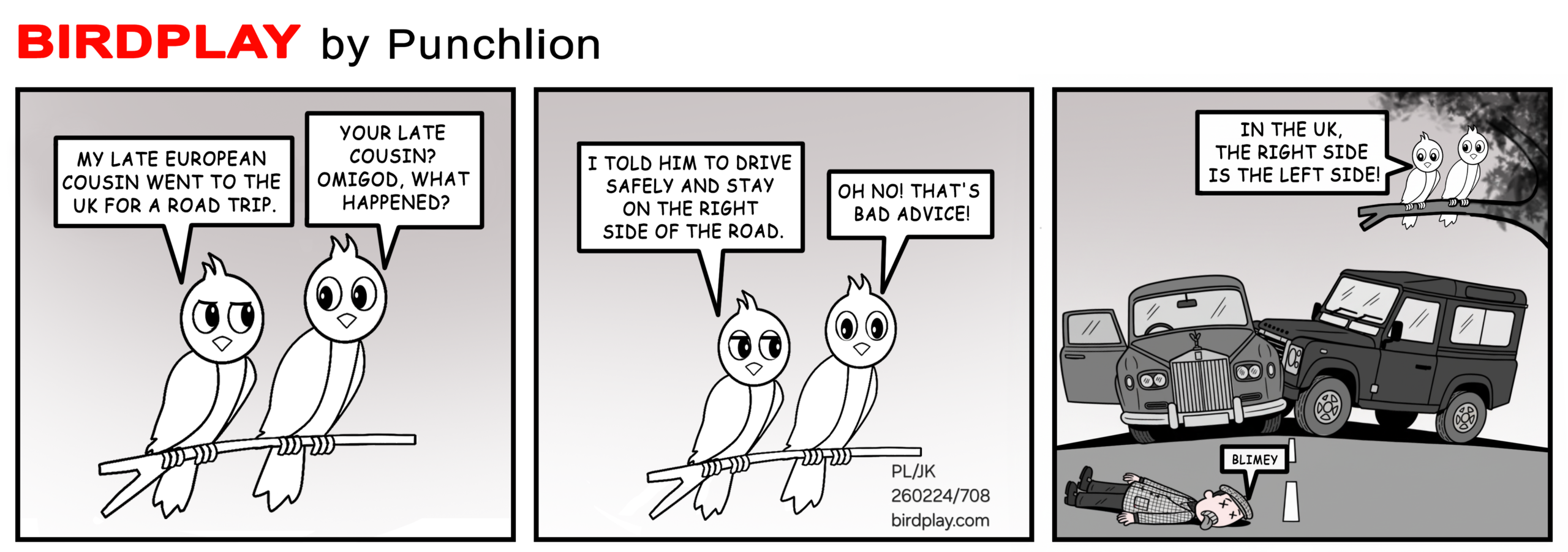 By Bird PlayFebruary 24, 2026 Late European cousin went to the UK Told him to stay on the right side In the UK the right side is the left side Blimey 🛣️🕊️ 24 Feb 2026 #Birdplay #dailycartoon #dailytoon