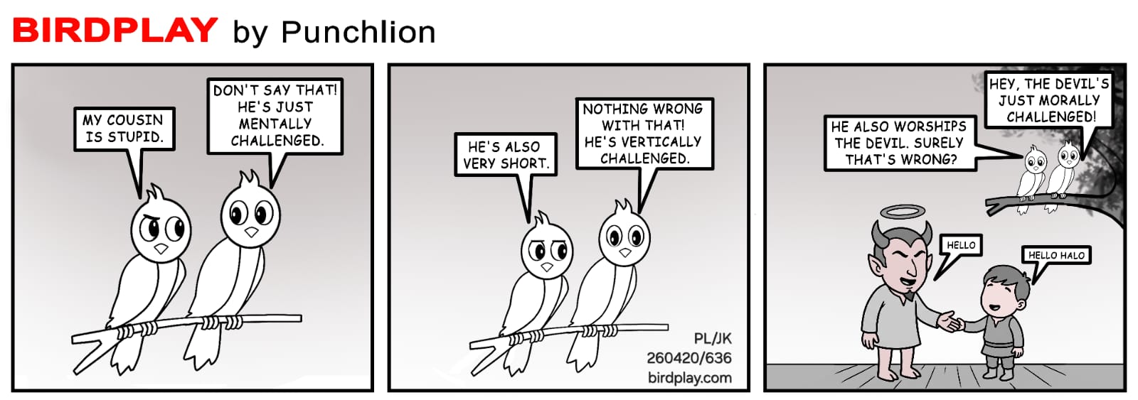 My cousin is stupid mentally challenged He’s also very short vertically challenged He worships the devil morally challenged Hello halo 👹🕊️ 20 Apr 2026 #Birdplay #dailycartoon #dailytoon