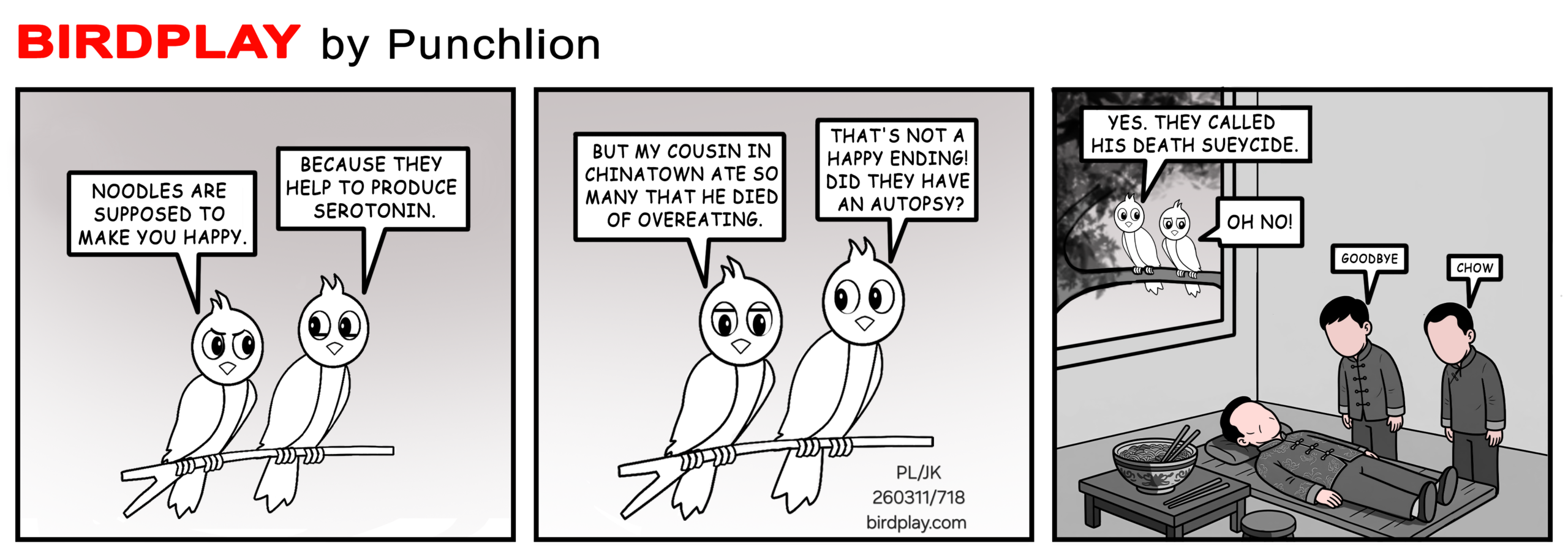 Noodles are supposed to make you happy They help produce serotonin Cousin in Chinatown ate too many and died They called his death Sueycide 🍜🕊️ 11 Mar 2026 #Birdplay #dailycartoon #dailytoon