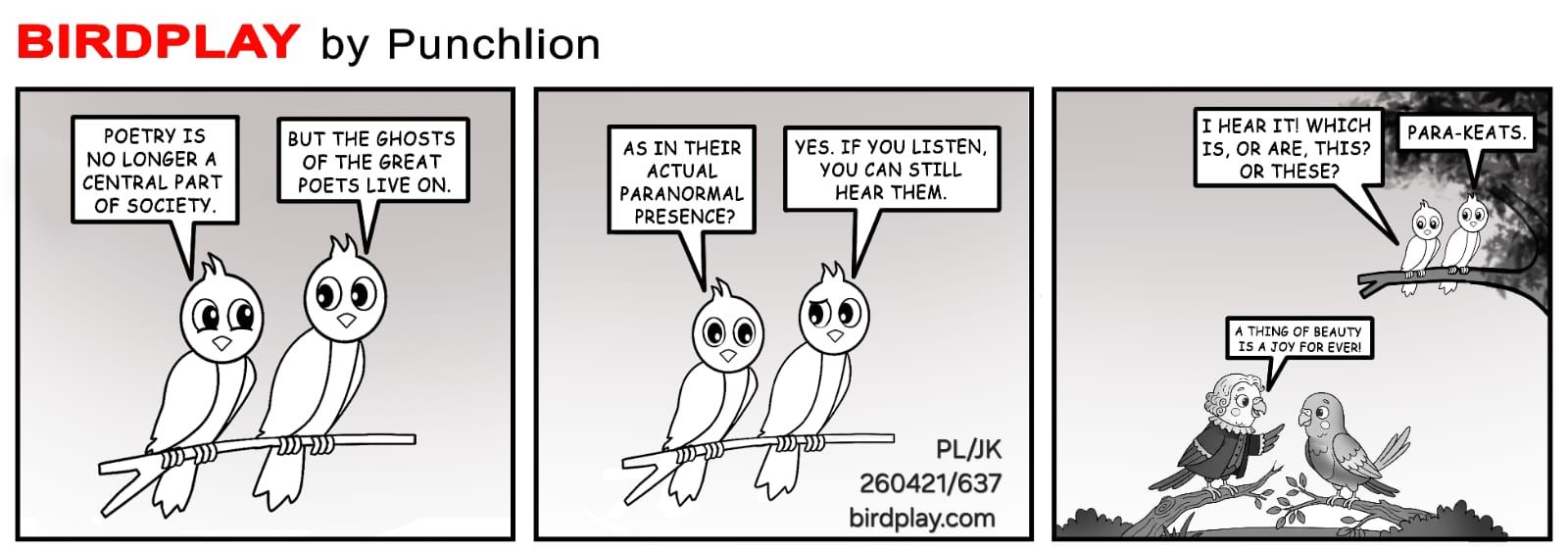 By Bird PlayApril 21, 2026 Poetry no longer central in society Ghosts of great poets live on Listen you can still hear them Para‑Keats 🪶🕊️ 21 Apr 2026 #Birdplay #dailycartoon #dailytoon