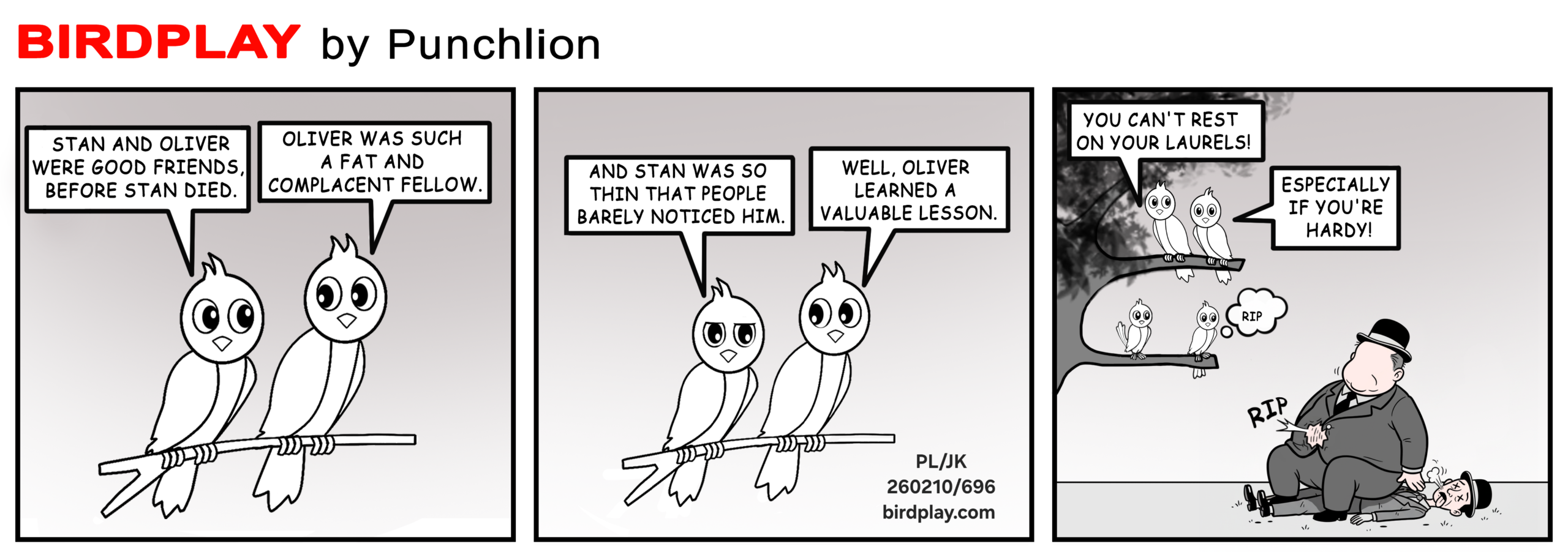 By Bird PlayFebruary 10, 2026 Stan was thin, Oliver complacent. You can’t rest on your laurels… Especially if you’re Hardy. 🎭🕊️ 10 Feb 2026 #Birdplay #dailycartoon #dailytoon