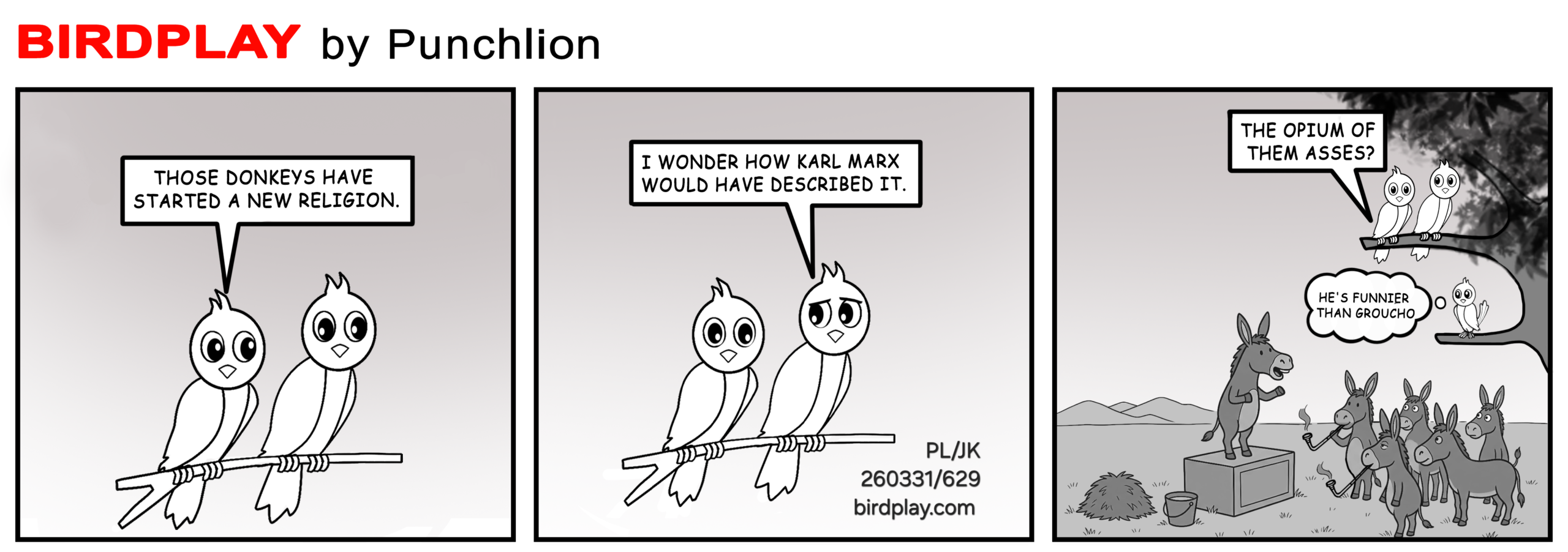By Bird PlayMarch 31, 2026 Those donkeys started a new religion Wonder how Karl Marx would describe it The opium of them asses He’s funnier than Groucho 🫏🕊️ 31 Mar 2026 #Birdplay #dailycartoon #dailytoon