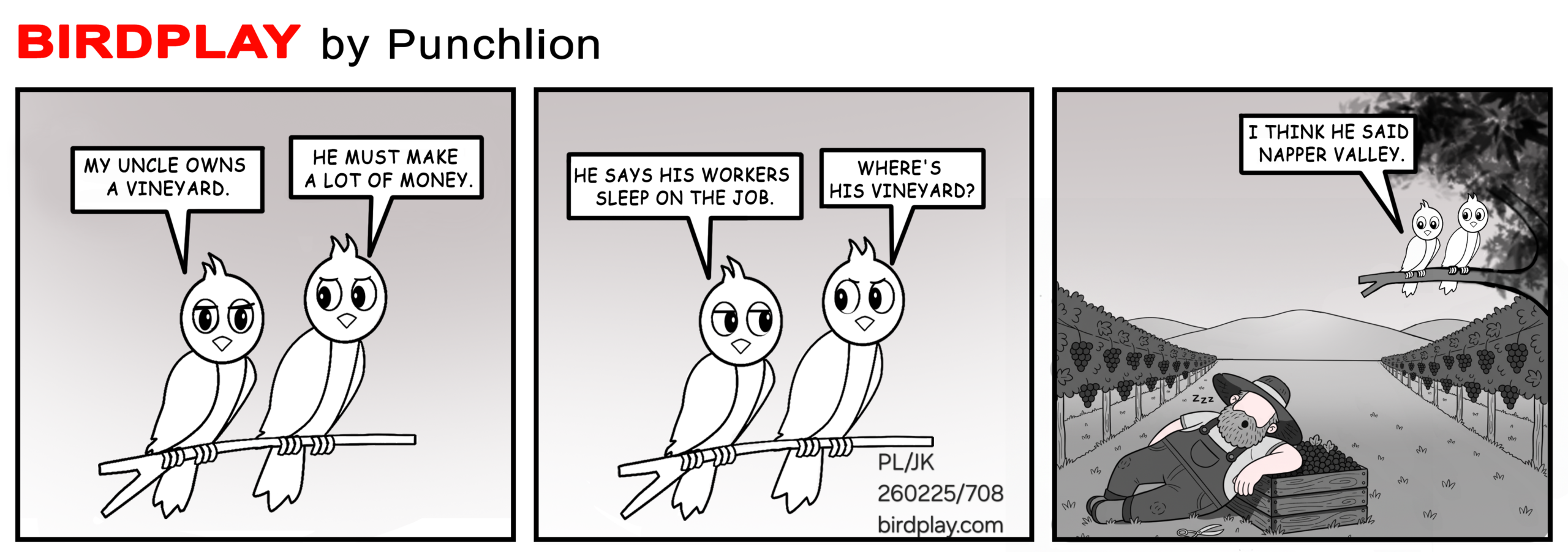 By Bird PlayFebruary 25, 2026 Uncle owns a vineyard Workers sleep on the job Where is it He said Napper Valley 🍇🕊️ 25 Feb 2026 #Birdplay #dailycartoon #dailytoon