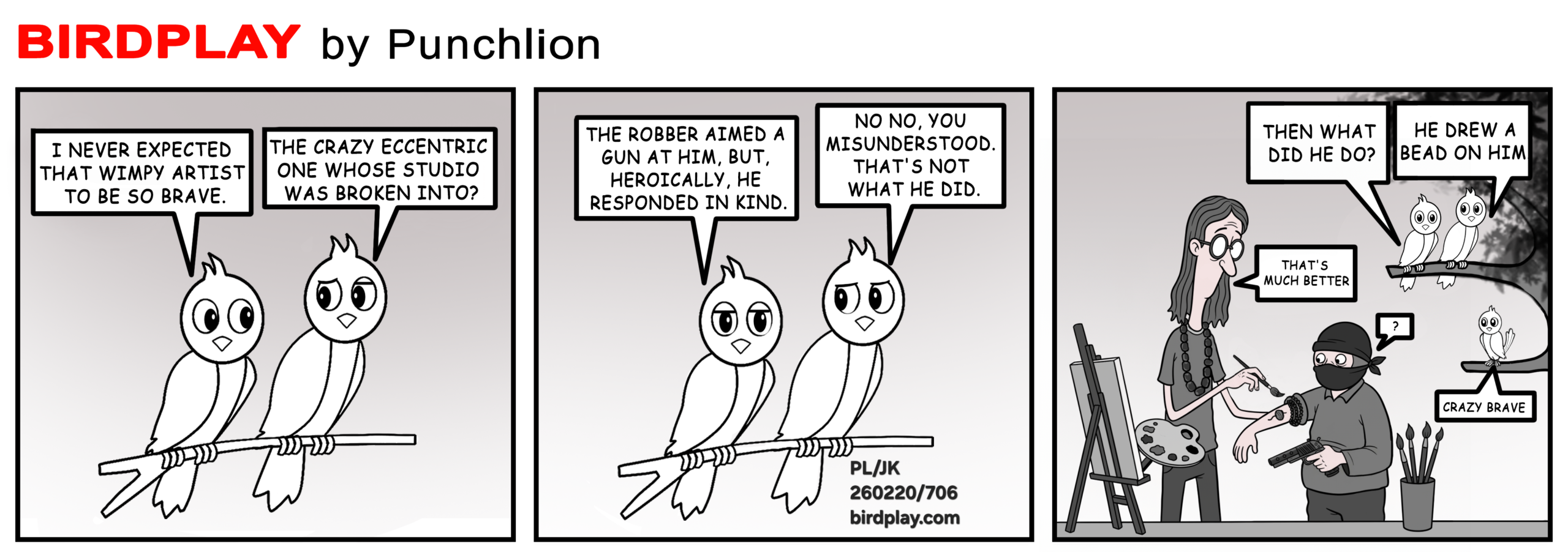 By Bird PlayFebruary 22, 2026 Wimpy artist turned brave Robber aimed a gun at him He drew a bead instead Crazy brave indeed 🎨🕊️ 20 Feb 2026 #Birdplay #dailycartoon #dailytoon